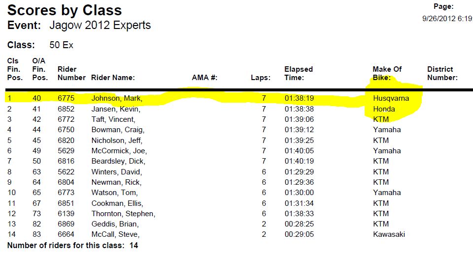 Preliminary Results are in; Mark repeats as OMRA GP 50 Expert #1, this year on the Johnson Bros/BMP/Watson Suspension TXC511